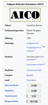 Seit 1987 trägt sie den Namen „Bewegung indigener Autoritäten Kolumbiens“. Verfassunggebende Versammlung einberufen wurde, beschloss die AICO, sich als politische Bewegung zu profilieren und eine eigene Liste zu starten, die die Wahl von Lorenzo Muelas erreichte. Er wurde 1991 mit 20.083 Stimmen in die Verfassunggebende Versammlung gewählt. Seine herausragende Leistung während der Sitzungen der Versammlung im Jahr 1991 ermöglichte es ihm, 1994 mit 27.000 Stimmen zum Senator gewählt zu werden. Floro Tunubalá wurde wenig später zum ersten indigenen Gouverneur des Landes gewählt. (2)