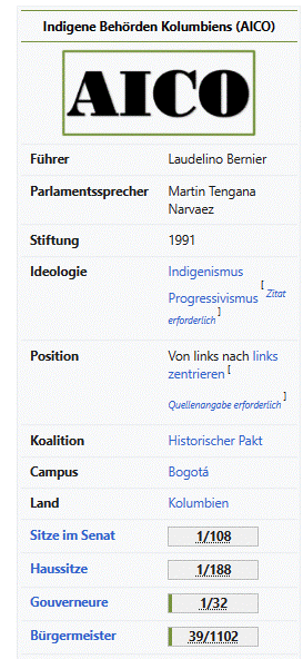 Die Bewegung der indigenen Autoritäten Kolumbiens oder AICO ist eine indigene politische Bewegung, die als politische Partei am 15. August 1991 anerkannt wurde. Hervorgegangen aus dem Kampf um Land und deren Verteidigung der Rechte der indigenen Völker. Seit ihrer Gründung beteiligt sie sich aktiv am politischen Leben des Landes. Es schlägt ein Modell und eine Funktionsweise vor, die auf den Prinzipien Territorialität, Autonomie, Identität, eigene Geschichte, Partizipation, Vielfalt und Interkulturalität basiert und sich in der kolumbianischen Gesellschaft und den internationalen Beziehungen indigener Völker manifestieren. Ihr derzeit einziger Kongressabgeordneter ist der Senator des indigenen Wahlkreises Polivio Leandro Rosales Cadena.