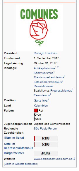 Comunes ist eine linke politische Partei und wurde am 01. September 2017 als Nachfolgeorganisation der FARC gegründet. Bis zu seiner Umbenennung 27. Januar 2021 hieß sie Alternative revolutionäre Kraft des Volkes (Fuerza Alternativa Revolucionaria del Común (Farc). Hintergrund ist der Friedensprozess und der angeschlossen Vertrag zwischen der Regierung und der FARC, der zusichert das sich die FARC legal politisch Betätigen darf. Ausrichtung Kommunismus, Marxismus-Leninismus und Bolivarismus.