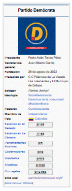 Die Kolumbianische Demokratische Partei ist die erste politische Partei palenqueroischen-Ursprungs in der Geschichte Kolumbiens. Sie konstituiert sich als breite politische Plattform, die auf Sozialdemokratischen Grundlagen basiert und aus der Notwendigkeit heraus entstanden ist, Räume der Partizipation zu fördern, in denen alle Kolumbianer ohne Unterschied ihrer ethnischen Zugehörigkeit, ihres sozialen Zustands oder ihrer Identität zum Aufbau eines gerechteren Landes beitragen können, mit besseren Studienmöglichkeiten, besseren Jobmöglichkeiten und Lebensqualität.
