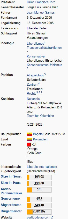 1 Juan Manuel Santos: Ási nació el Partido de la U partudodelau.com, abgerufen am 10.09.2022 (spanisch)