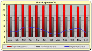Aufgrund der Nähe zum Äquator gibt es in Cali keine großen saisonalen Schwankungen wie Winter, Frühling, Sommer und Herbst. Einheimische bezeichnen die Trockenzeit jedoch als den "Sommer", in dem die Temperaturen auf 34 bis 36 ° C ansteigen und auf 18 bis 19 ° C in der Nacht abfallen können. Während der Regenzeit "Winter" können die Temperaturen am Tag auf 28 bis 29 ° C und nachts auf 16 bis 17 ° C sinken. Es gibt normalerweise zwei Regenzeiten: von März bis Mai und von Oktober bis November. Es ist jedoch zu erwarten, dass zu jedem Zeitpunkt des Jahres Regen fällt, der die dauerhaft grüne und üppige Vegetation der Stadt nährt. 1