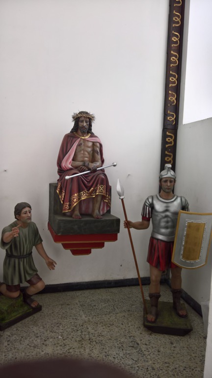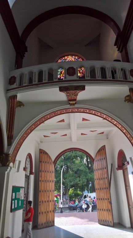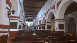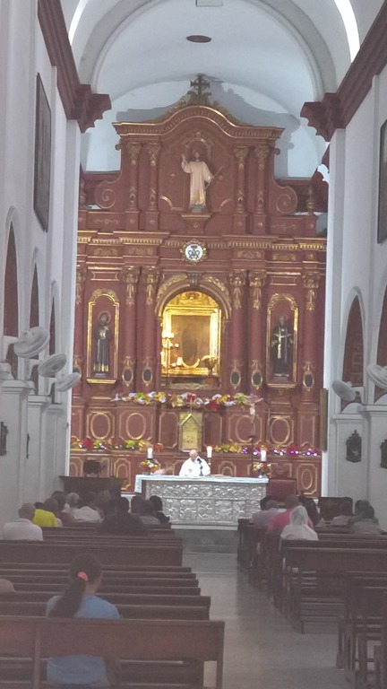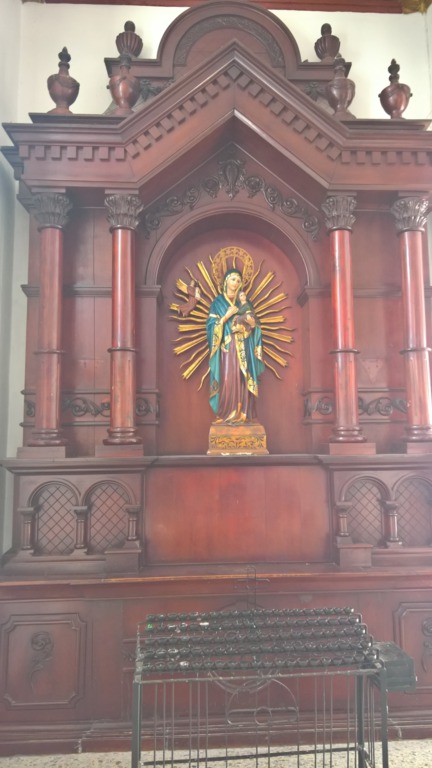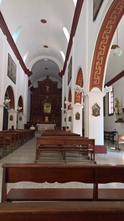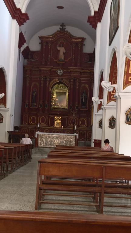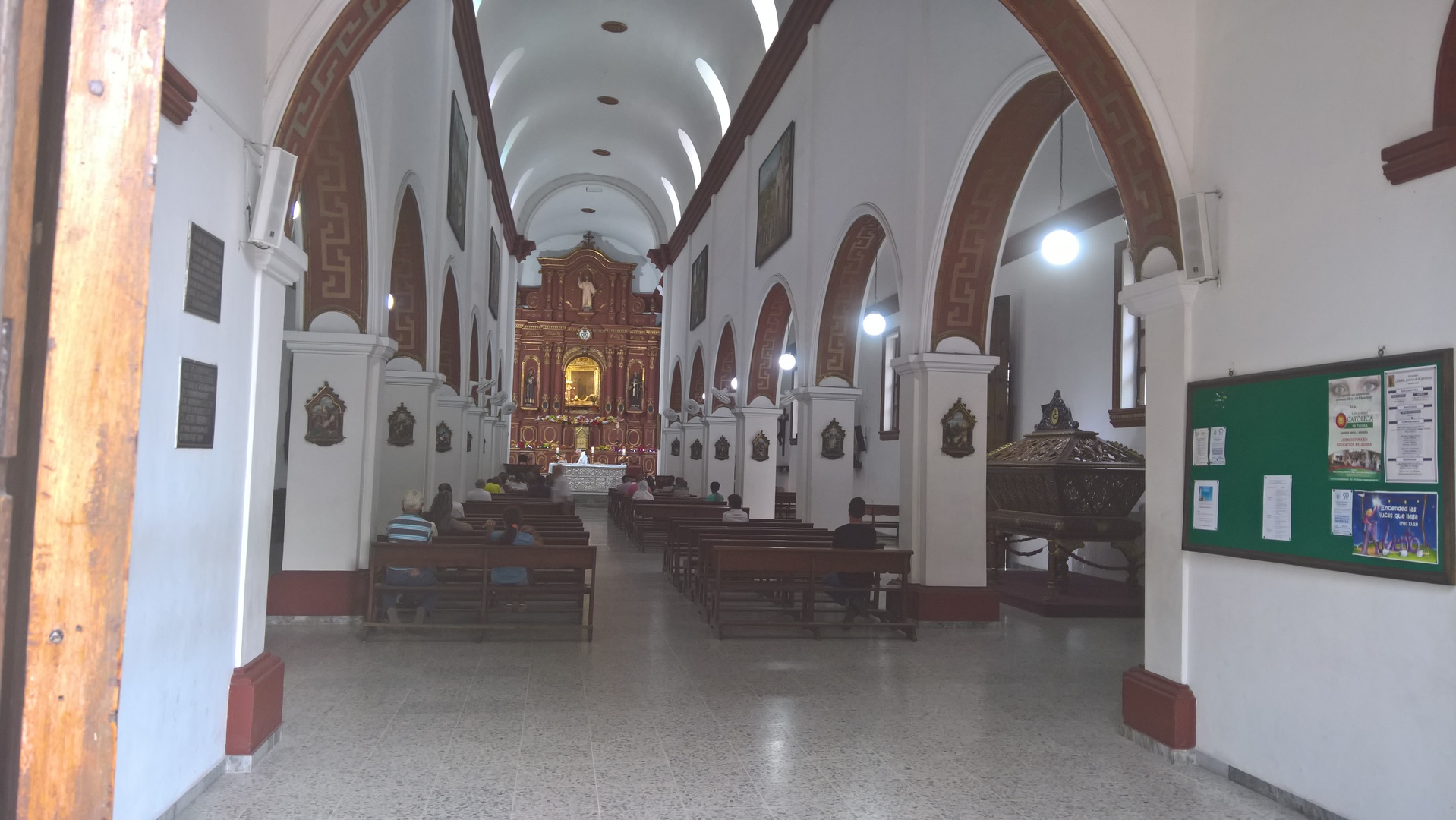 Bevor sie jedoch die Carrera 5 Richtung Park überqueren, besuchen sie die dort stehende Kirche de San Jorge. Sie können die Kirche sowohl von der Stirnseite und der Parkseite betreten. Sie beeindruckt besonders durch die Größe im inneren was man ihr, von außen nicht ansieht. Das Mittelschiff wird von zwei mächtigen Säulenreihen getragen. In etwa Mitte der Kirche befindet sich seitlich ein weiteres kleineres Schiff mit Altar.