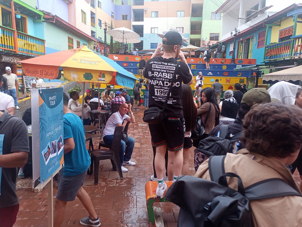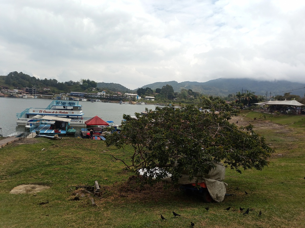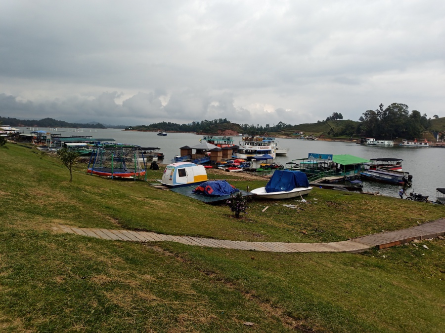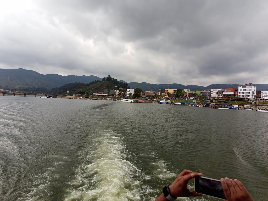 Wir komme gegen 10:00 Uhr mit dem Bus in Guatapé an und lassen uns von so einer Art TukTuk in die See Promenade, dem Malecón fahren. Das Wetter sieht nach Regen aus und besonders warm ist es nicht. Ein gutes Geschäft für die hier anwesenden Händler die neben vielen anderen Andenken, Regenmäntel und Ponchos verkaufen. Viel Zeit habe ich nicht und begebe mich zu den bereits wartenden Touristenschiff. Das wenige Minuten später ablegt. Diese ca. einstündige Rundfahrt habe ich leider nicht gut in Erinnerung. Ich habe auf dem Schiff fürchterlich gefroren. Auch in Kolumbien gibt es kälte, nehmt immer für den Notfall was Warmes zum Anziehen mit.