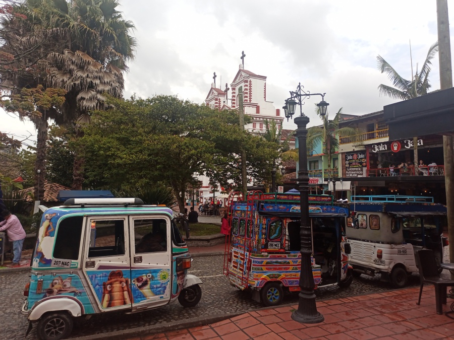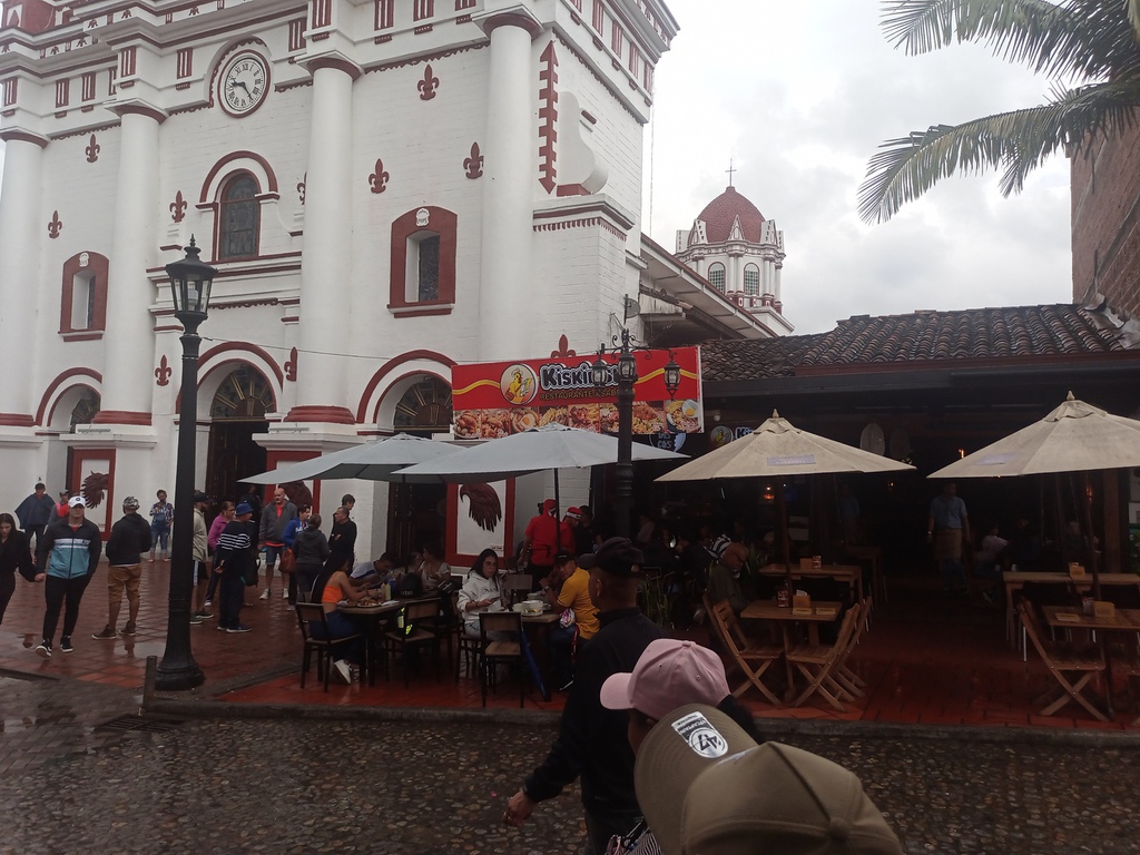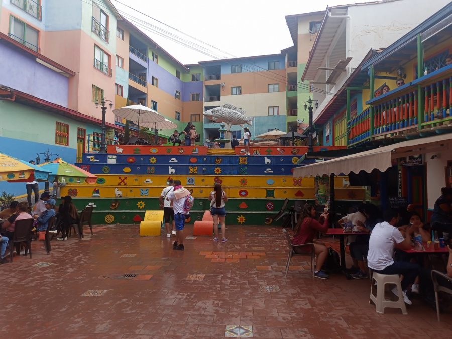 Parque Principal de Guatapé, der Hauptpark des Ortes. Ein sehr beliebter Ort, wo man sich zum Plaudern trifft. In der Mitte, ein Brunnen, der einen großen Teil des Platzes einnimmt. Um ihn herum Plätze zum Kaffeetrinken. und die Aussicht auf einen wunderschönen Sonnenuntergang. Geschäfte voller Kunsthandwerk und andere Läden. Auffallend sind die Gebäude drumherum. Von hier bieten sich Motorradtaxi- und Jeep-Transportdienst an, um nach La Piedra oder in die Gemeinde Peñol zu gelangen.