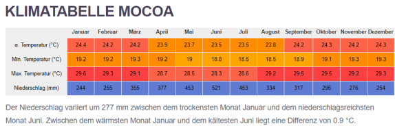 In Mocoa sind die Sommer kurz, warm und bedeckt; die Winter sind kurz, angenehm und größtenteils bewölkt, und es ist das ganze Jahr über nass. Im Verlauf des Jahres bewegt sich die Temperatur in der Regel zwischen 19°C und 29°C und liegt selten unter 18 C oder über 31 °C.