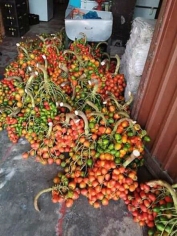 Die Pfirsichpalme oder Stachelpalme. 20 Meter hohe Stamm und die Blätter sind zum Teil dicht mit Stacheln besetzt. Die Frucht ist eine bis 8 Zentimeter große und eiförmige Steinfrucht mit einem essbaren, orange-weißlichen Fruchtfleisch, das den einzelnen, dunklen Steinkern umgibt, dieser ist bis 4 Zentimeter groß. Die Früchte können rot, orange oder gelb sein, abhängig von Reifegrad und Palmensorte.