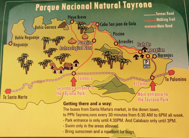 Innerhalb des Tayrona Nationalparks kommt man vor allem nur zu Fuß weiter. Die Strecke vom Haupteingang Canaveral (wo der Bus hält) nach Cañaveral selbst kann man auch per Kleintransporter oder eigenem PKW zurücklegen. Dies ist dann aber auch schon die einzige asphaltierte Strecke, alle anderen Wege sind unbefestigt. Ich empfehle die 8 Km den Kleinbus für 2000 Pesos zu nehmen. Es lohnt sich einfach nicht die Asphaltstraße entlangzulaufen. Kostet nur unnötigerweise Zeit was vielleicht später fehlt.
