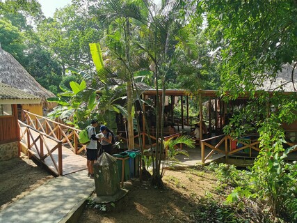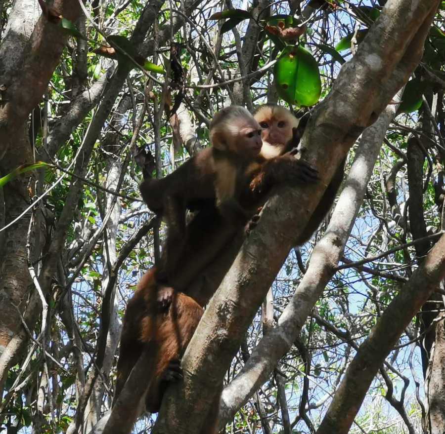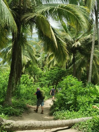 Hier lässt sich im offenen Schilfbedeckten Restaurant bei einem schönen kühlen Bier gut ausruhen. Wer will kann natürlich auch essen. Nach einer gemütlichen Pause geht es über Playa Piscina nach Cabo San juan de Guia, eine traumhafte Badebucht. Die Strecke führt zum großen Teil durch Wald und überquert einen kleinen Fluss. Wer Glück hat kann unterwegs das Treiben von Affen beobachten. Auch die unterschiedlichsten Vogelarten und Schmetterling sind zu sehen.