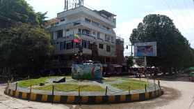 Nach ca.10 Minuten erreiche ich die Kreuzung Calle 10 – Carrera 20 als Kreisverkehr. Im Zentrum davon das Monumento a los fundadores y héroes de puerto asis. Denkmal für die Gründer und Helden von Puerto Asis.